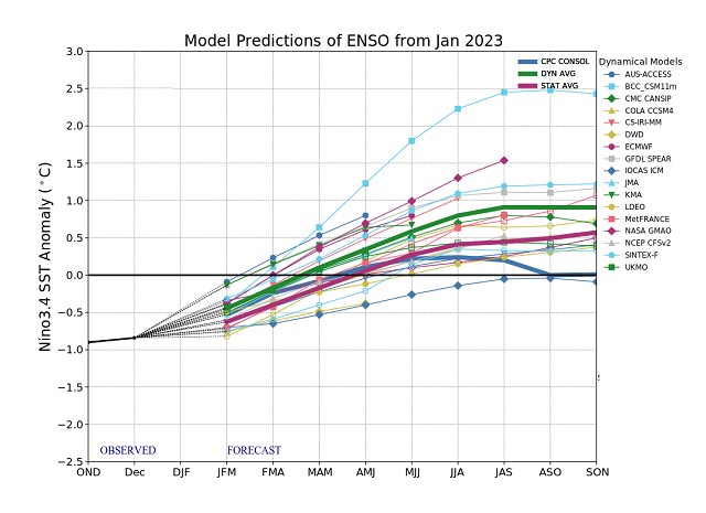 Los modelos de pronóstico de escala planetaria siguen mostrando valores de enfriamiento superficial en el Pacifico Ecuatorial Central. El ultimo índice de su anomalía indica –0.8ºC. Hubo un muy leve calentamiento respecto de enero. Las condiciones todavía son consistentes con la continuidad de La Niña. Pero es cierto, que hay una definida tendencia a la neutralidad plena a partir de marzo. Sin embargo, la buena noticia de febrero viene de la mano del Atlántico. Como está influenciado positivamente por la corriente de Brasil, está presentado una anomalía positiva de su temperatura superficial. Por el momento esto no se traduce en mejores lluvias para la región pampeana pero, si esta tendencia se mantiene, las aguas más cálidas alejan la probabilidad de enfriamientos continentales adelantados y sorpresivos.