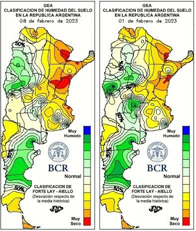 Y aparte el 10% de la soja de segunda está en floración y es el cultivo que más está sufriendo la seca. Por eso, es un momento de mucha tensión ya que la ocurrencia de las lluvias es vital para lograr mantener en pie los rindes que se estiman en esta semana. Por ejemplo en los alrededores de Rosario ya se estima un daño del 60% en rindes, pero debe llover para que no sigan pronunciándose. En Bigand señalan que con precipitaciones que superen 50 a 100 mm se podrán lograr rendimientos de 20 qq/ha. En Corral de Bustos, el grueso de la soja de primera va a estar en el orden de los 22 a los 25 qq/ha si llueve. Allí, la soja de segunda había mostrado una recuperación tras las lluvias, pero ahora muestra un fuerte deterioro. En Baradero, también muy castigado, el promedio del rinde de la de primera va a estar en el orden de los 15 a 20 qq/ha. En Carlos Pellegrini, la (soja) de primera tiene posibilidades de alcanzar 30 qq/ha. Los cuadros más privilegiados se concentran en el noroeste bonaerense: Gral. Villegas y Piedritas, esperan pisos de 30 qq/ha y techos de 45 qq/ha para la soja de primera.