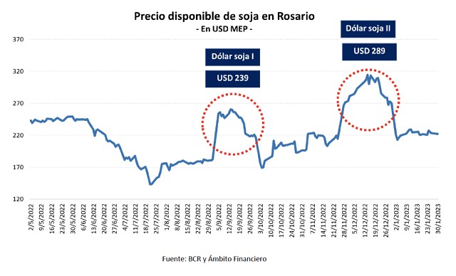 Una vez finalizado el programa, las compras y ventas de soja comenzaron a ralentizarse nuevamente y a fines de noviembre de 2022, alcanzaban el 73% de la producción cuando el promedio era del 78%. Nuevamente se implementa el “Dólar Soja”, que lleva el precio promedio a USD 289 contra los USD 227 que venía recibiendo el productor, implicando una mejora de USD 62 por toneladas (+27). Esta edición terminó con 6,4 millones de toneladas por USD 3.160 millones de toneladas, es decir, 9,6 millones de toneladas y USD 5.000 millones menos que el “Dólar Soja I. La razón del éxito del primer programa fue que atrajo a gran cantidad de productores, principalmente chicos y medianos que accedieron al beneficio, con una menor espalda financiera que aquellos que pueden utilizar la oleaginosa como reserva de valor.
