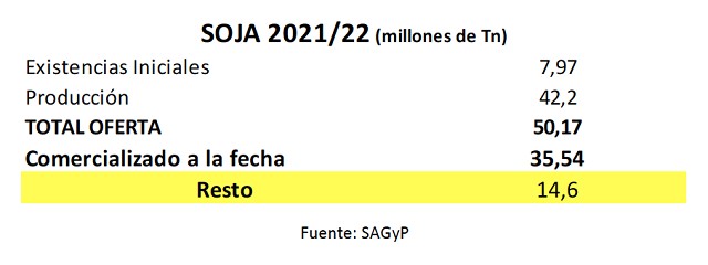 Teniendo en cuenta lo comercializado a la fecha, queda un remanente sin vender de la campaña 2021/22 de 6,7 millones de toneladas (16%) sumado a lo comercializado sin precio a fijar, 2,95 millones de toneladas, lo cual totaliza un valor de USD 6.000 millones. Si se suman las existencias iniciales de la campaña, 8 millones de toneladas por un valor de USD 4.900 millones, el total asciende a USD 10.900 millones.