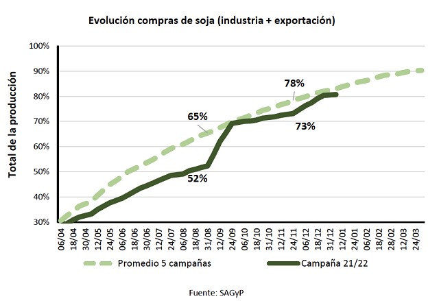 A la fecha, las compras por parte del sector exportador y la industria alcanzaron los 35,5 millones de toneladas, lo cual representa el 81% de la campaña 2021/22, cuando el promedio de las últimas cinco campañas ese porcentaje es del 85%. Una de las principales causas del menor ritmo de comercialización obedece a los menores incentivos que inducen al productor a vender una mayor cantidad de la oleaginosa: derechos de exportación y brecha cambiaria.