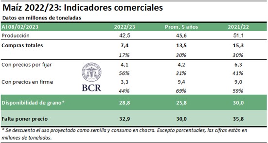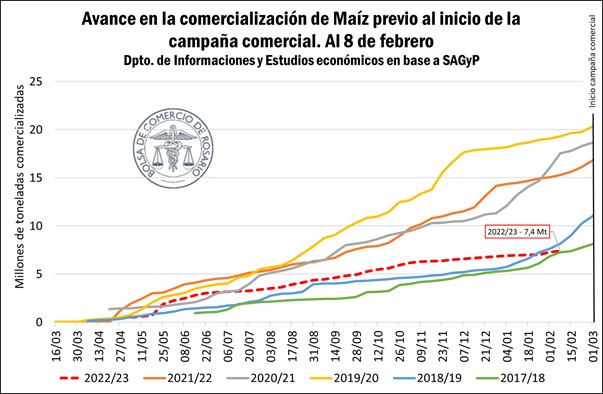 Aunque la campaña comercial de maíz 2022/23 inicia formalmente el primero de marzo, ya se comenzaron a recolectar los primeros lotes de maíz temprano, con rindes que se muestran previsiblemente magros. La campaña comienza con el menor volumen de mercadería vendida por parte de los productores en cinco campañas, habiéndose pactado apenas 7,4 millones de toneladas de maíz de nueva cosecha a la fecha. Esto se debe principalmente a la gran incertidumbre productiva con productores que no quieren quedar sobrevendidos. Al mismo tiempo, ante el conocimiento de que, si fallan las lluvias para el maíz tardío, la presión en el mercado puede exacerbarse catapultando los precios.