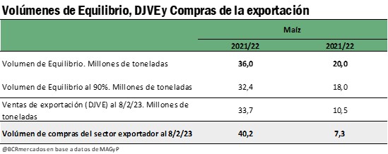 Actualmente, el sector exportador contaría con la mercadería necesaria para satisfacer sus ventas externas a la fecha. A pesar de que lleva compradas apenas 7,3 millones de toneladas de la campaña próxima a iniciar, las compras de mercadería de la campaña 2021/22 se ubican fuertemente por encima de las 33,7 Mt que se llevan vendidas, e incluso de los 36 millones de toneladas que representa el Volumen de Equilibrio de esa campaña.