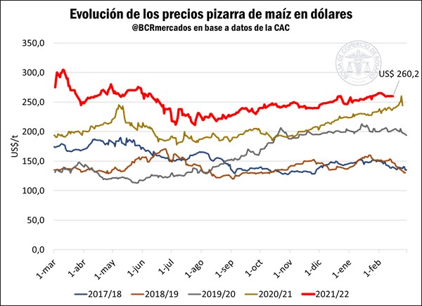 El precio del maíz se ubica en torno a los US$ 260/t en el mercado doméstico (CAC – BCR), marcando el mayor valor para este momento del año desde que se tiene registro.