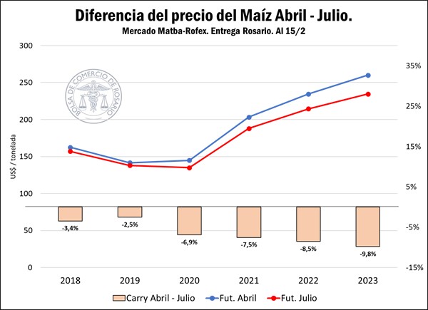 Esto puede verse en el carry fuertemente negativo que mantiene la posición Julio con respecto a la posición Abril. Actualmente, ambas posiciones operan con una diferencia de US$ 25,5 en favor de la entrega en abril, una diferencia porcentual del 9,8% entre posiciones. Esta diferencia se ubica por encima del año previo (8,5%) y muy por encima del promedio de los últimos cinco años (5,8%). Incluso, este costo de traslado temporal llegó a ubicarse por encima de los US$ 36 hacia octubre del 2022.
