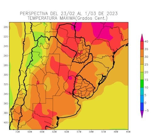 La perspectiva comenzará con vientos del trópico causando temperaturas máximas de variada intensidad, con focos de calor intenso sobre el interior del área agrícola, y registros moderados sobre las zonas serranas y el litoral atlántico. Paralelamente, tendrá lugar el paso de un frente de tormenta, provocando precipitaciones abundantes sobre el norte, el oeste y el extremo sur del área agrícola, pero dejando un amplio foco de registros escasos que afectará a gran parte del área agrícola principal argentina y al Uruguay, así como al oeste y el centro del Paraguay.