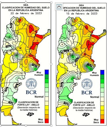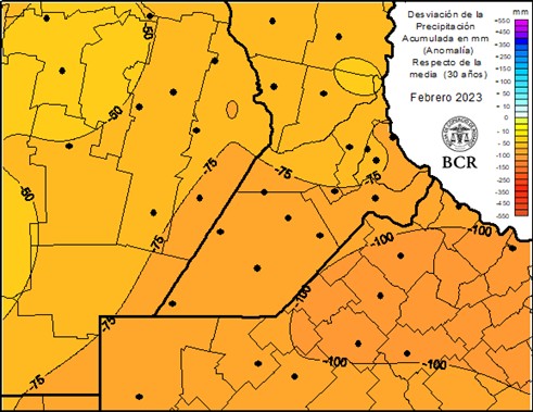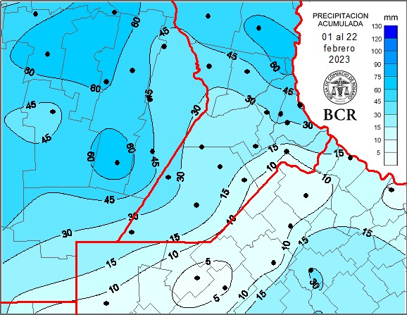 Transcurridas tres semanas de febrero, las lluvias acumuladas sobre la región núcleo apenas alcanzan entre el 10 y el 50% de los valores mensuales medios estadísticos. Los valores promedio para la región oscilan de 90 a 120 mm (de oeste a este). En el noreste de Buenos Aires la faltante es de más de 100 mm para alcanzar el promedio de lluvias de febrero de los últimos 30 años. En el noroeste bonaerense y en el sur santafesino el déficit es de 75 y 100 mm. En el centro sur santafesino y el sudeste cordobés las lluvias le deben entre 75 a 50 mm para alcanzar el promedio del mes. Sin embargo las proyecciones meteorologías no son optimistas en cuanto a la posibilidad de precipitaciones que permitan revertir el balance negativo de febrero: “los pronósticos indican que no tendremos aportes importantes de agua hasta el final del mes, por lo que febrero se encamina a sumarse a la lista de meses pluvialmente deficitarios”, dice el consultor Elorriaga.
