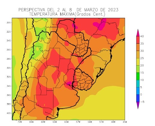 • El noroeste del Paraguay, el sudeste del NOA, el nordeste y el oeste de la Región Pampeana y el oeste del Uruguay registrarán focos de calor intenso con máximas superiores a 35°C, y focos aislados de más de 40°C.