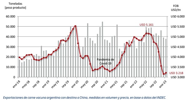 Actualmente, a diferencia de aquel entonces, partimos de precios muy bajos. En diciembre -último dato disponible por Aduana China- el valor promedio pagado en puertos chinos por la carne importada de todo origen se situaba en los USD 5.916, reflejando una baja del 17% respecto de pico de valores marcado en julio, como consecuencia del deterioro de la actividad económica y la menor capacidad de compra ocasionadas por las políticas restrictivas de Covid-cero.