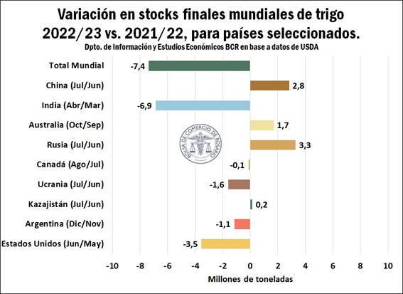 Por último, el Departamento de Agricultura de los Estados Unidos (USDA) estima aumentos de los stocks finales de trigo en China, Australia y Rusia para este ciclo productivo, cuyo efecto bajista tiende a contrarrestar el impacto alcista de un nivel de stocks finales globales inferior al ciclo pasado. No obstante, y como se comentó debidamente en otra edición del informativo semanal, para Estados Unidos, Argentina, Ucrania y la India se proyecta una caída en las existencias finales, y ello está ocasionando reordenamientos al interior de la oferta comercial.