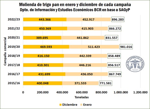 Teniendo en cuenta los dos primeros meses de campaña, este ciclo comienza con un ritmo firme de molienda de trigo pan, que se proyecta un 3,4% por encima del mismo período del ciclo anterior. Si bien diciembre de 2022 comenzó con niveles por debajo de los de la campaña previa, en enero el volumen de molienda de trigo pan anotó 452.917 toneladas, el valor más alto en tres campañas y el segundo valor más alto en 8 años, sólo superado por el ciclo 2019/20.