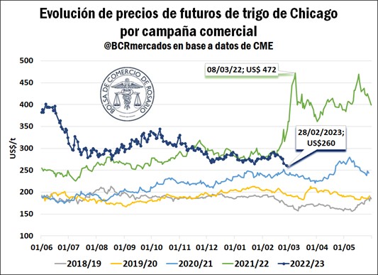 En la plaza norteamericana, los futuros de mayor volumen operado del trigo alcanzaron bajas pronunciadas en las últimas jornadas, y descendieron a niveles no vistos desde noviembre de 2021. Se identifican varios factores, por un lado, mayores prospecciones de siembra de trigo nuevo en EEUU y unas condiciones climáticas que muestran cierta mejora en las llanuras del país del Norte. Por otro lado, la competitividad del grano proveniente del Mar Negro y de Australia operó negativamente en los precios del cereal estadounidense.