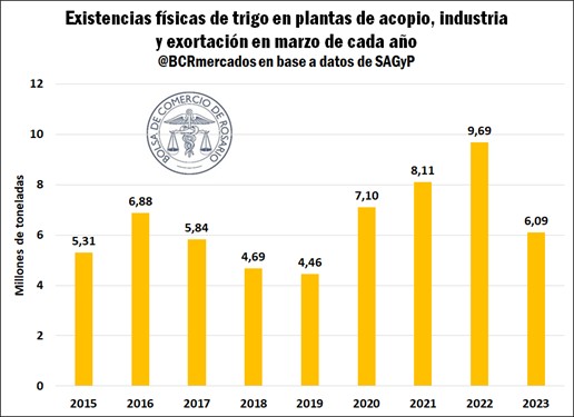En este sentido, la caída en el nivel de producción continúa arrojando a mínimos de al menos 4 años a los stocks de trigo argentino. Como muestra la siguiente imagen, las existencias del cereal contando acopio, industria y exportación según la Secretaría de Agricultura, Ganadería y Pesca de la Nación (SAGyP) al 1° de marzo de 2023 fueron las más bajas para un marzo desde 2019.