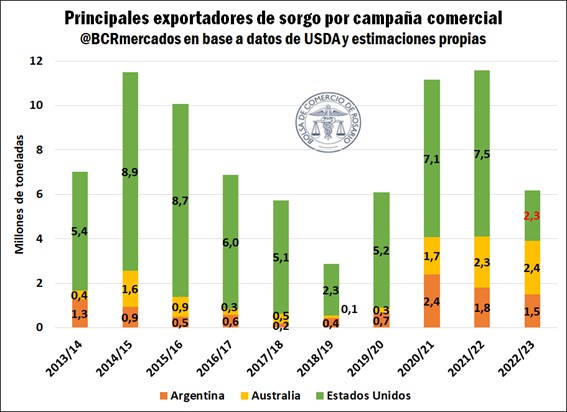 Este nuevo escenario internacional podría permitir que tanto Argentina como Australia puedan penetrar más pronunciadamente en el comercio mundial del sorgo, ganando participación en comparación con las campañas anteriores. Para el caso australiano, según el USDA las exportaciones de este país se estiman en 2,4 Mt, derivadas de una producción récord de este cultivo que se proyecta en 2,9 Mt. Este guarismo es aún mayor que el récord productivo de sorgo alcanzado en el ciclo previo, donde se habían anotado 2,7 Mt.