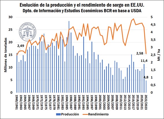 Debido a que casi el 90% del sorgo estadounidense se produce en los estados de Kansas y Texas, estados agrícolas que han sufrido la sequía más pronunciadamente durante la última siembra, con menores lluvias sobre los territorios, el rinde estimado para la campaña nueva es de 2,6 t por hectárea, representando el menor rendimiento desde, al menos, el ciclo 1960/61.