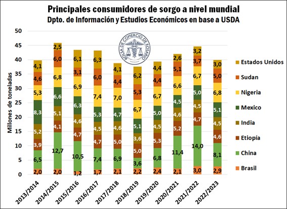 A nivel país, China es el mayor demandante de sorgo del mundo, y el Departamento de Agricultura de los Estados Unidos (USDA) proyecta una caída del 42% en el consumo doméstico de este país para la campaña 2022/23. Además, el gigante asiático es el principal destino del sorgo estadounidense, por lo que la baja en la oferta de Estados Unidos se correlaciona con la caída en las importaciones de este cultivo en China.
