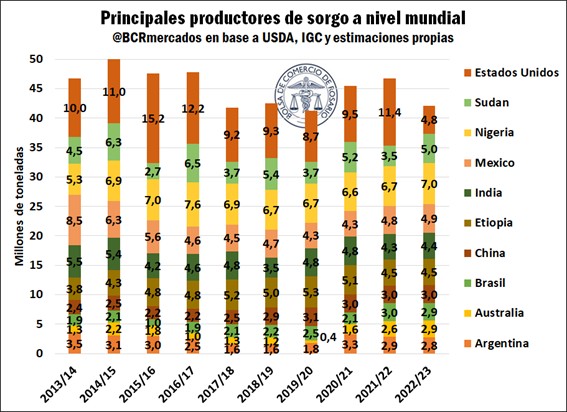 Como se comentaba anteriormente, según el USDA el 97% de la oferta comercial del sorgo a nivel mundial se explica entre Estados Unidos, Argentina y Australia. El resto de los productores de peso, como Nigeria, Sudán, México, Etiopía, India, entre otros, destinan la producción al mercado doméstico y, de hecho, tienen leves necesidades de importación anual, sin posibilidad de exportar en el corto plazo en vista de la importancia de la ganadería en estos países.