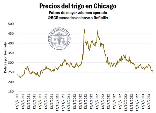 Respecto a la plaza rosarina, si bien mejoró el número de compradores activos, en la semana la dinámica del Recinto de Operaciones de la Bolsa de Comercio de Rosario encontró escaso volumen comercial operado de trigo. Tanto Chicago como MatbaRofex mostraron caídas cercanas al 1% en los precios a lo largo de la semana.