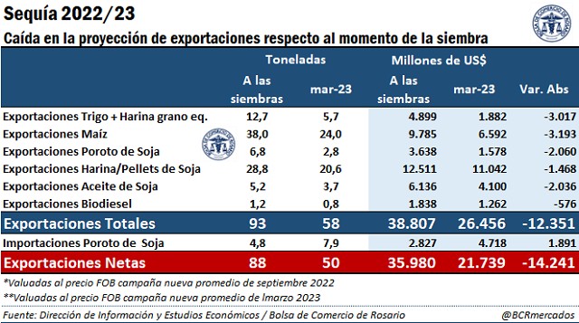 Valuando las cantidades proyectadas en septiembre a los precios vigentes en ese momento, en comparación con las proyecciones y precios al día de la fecha, la caída en el valor estimado de las exportaciones netas 2022/23 como consecuencia de la sequía y atribuibles a los complejos soja, maíz y trigo asciende a US$ 14.240, o un 40% de lo proyectado hace apenas un semestre.