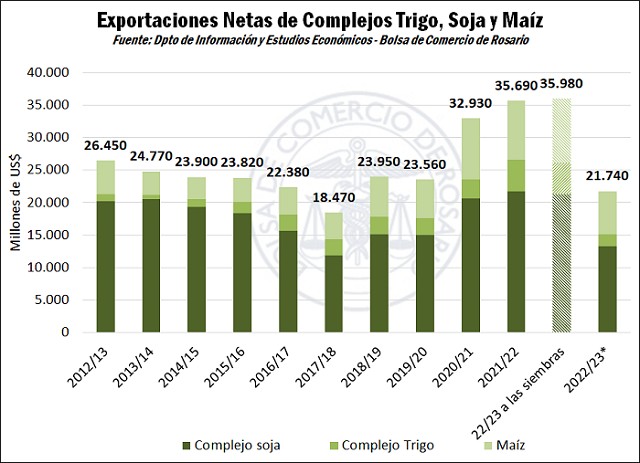 Respecto a las exportaciones netas de los complejos trigo, soja y maíz, ello es, incluyendo los despachos de aceites, harinas, biodiesel, y demás productos obtenidos por el procesamiento de los granos, la proyección de ingreso de divisas para la campaña 2022/23 cae a US$ 21.740 millones, US$ 13.950 millones por debajo de la anterior campaña 2021/22 y US$ 14.240 millones por detrás de lo que se proyectaba al momento de las siembras, en septiembre de 2022.