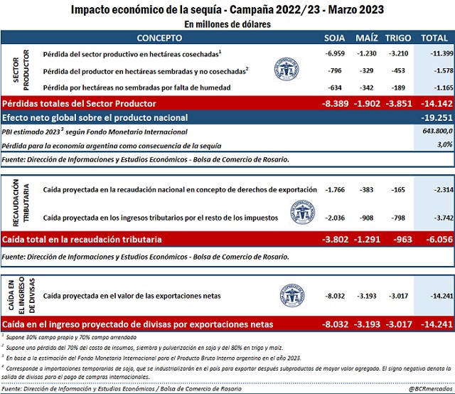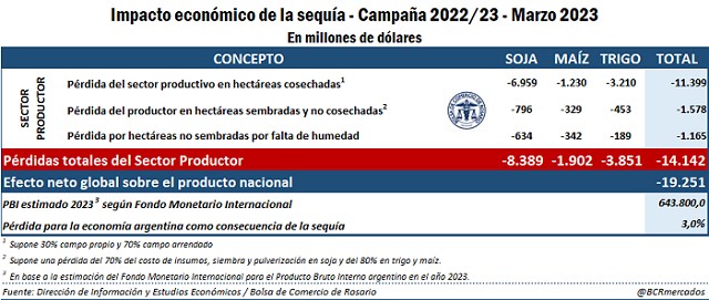 Utilizando el porcentaje del coeficiente multiplicador del agro que afecta exclusivamente el consumo interno de Argentina, puede estimarse que la pérdida de ingresos por US$ 14.140 millones del sector primario impactará en una caída del Producto Bruto Interno argentino de US$ 19.250 millones; ello es, 3 puntos porcentuales del PBI potencial estimado para la Argentina en 2023 según el Fondo Monetario Internacional, el cual asciende a U$S 643.800 millones.