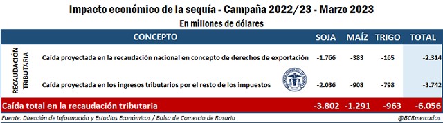 Sumando ambos conceptos, la masa tributaria ha perdido a la fecha US$ 6.056 millones como consecuencia del impacto de la sequía sobre los cultivos de trigo, soja y maíz.