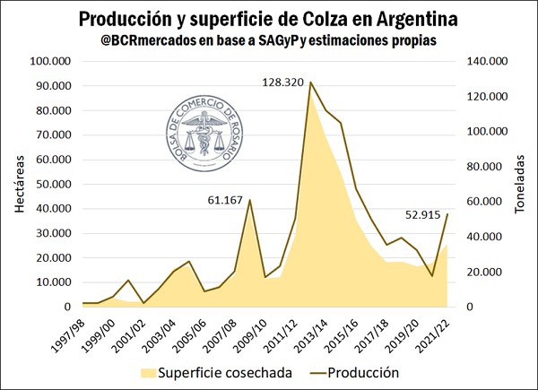 Hacia la actualidad, la campaña 2021/22 de colza en Argentina se acerca a las 53.000 toneladas de producción, casi el triple de la campaña pasada. Más superficie y más rinde vuelven a darle ímpetu a la producción nacional de colza, aunque los números aún siguen por debajo de los máximos históricos de producción del año 2012/13.