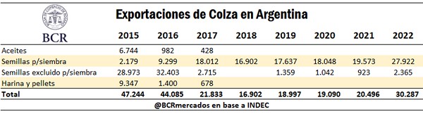 Si bien hoy nos encontramos con elevados niveles de secreto estadístico en la exportación de colza, aún así podemos deducir que la porción más importante de la producción tiene por destino final la exportación como semilla. Estados Unidos es el principal destino de nuestras exportaciones de colza, con una participación cercana al 90%. Si bien existe procesamiento industrial de la colza y muchas potencialidades para explotarlo, el mismo es escaso en relación con el elevado volumen comercializado al exterior en forma de semilla. Como dato de interés, a partir de 2023 dejó de ser obligatoria la Declaración Jurada de Venta de Exportación (DJVE) de colza.