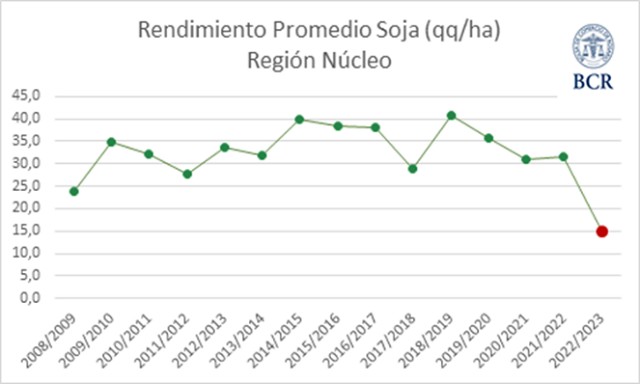 Siguen en carrera 3 millones de hectáreas, pero en donde el rendimiento aun no encontraba piso. El promedio de toda la región pasó de 18 a 15 qq/ha. Esto es un 63% menos del rinde medio regional.