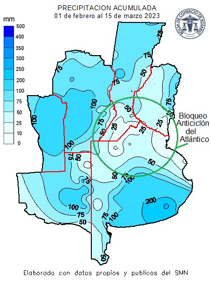 Finaliza la mitad de marzo con ola de calor inédita y lluvias escasas sobre la región. El consultor Elorriaga explica que la causa de este hecho fue la persistencia de un bloqueo atmosférico, asociado a la posición del anticiclón del Atlántico sobre el área central del país. “Este intenso centro de alta presión situado frente a la costa este de Argentina impidió durante los últimos 45 días el ingreso de los sistemas frontales hacia el centro del país. “El resultado fue una virtual barrera de circulación que dificultó el avance de lluvias y tormentas más allá del centro bonaerense, La Pampa y la franja oeste de la región pampeana llegando hasta el norte del país. Es decir, una campana invisible que mantuvo ausentes las lluvias sobre el sudeste de Córdoba, centro-sur de Santa Fe, Entre Ríos y norte de Buenos Aires”.