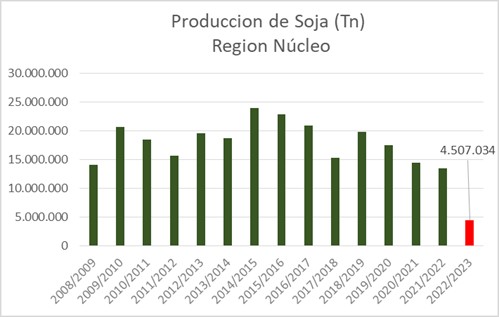 En la región núcleo, la campaña comenzó esperando producir 19,7 Mt de soja (escenario normal de clima). Pero sin lluvias que pongan un piso, los recortes productivos continuaron. Recapitulando, el 9 de febrero la estimación bajó a 10,4 Mt; el 2 de marzo, a 6,5 Mt; y a este 16 de marzo se reajustó a 4,5 Mt. Lamentablemente, se repite la advertencia de 2 semanas atrás respecto de que la situación todavía puede empeorar. Por el momento, se estima que la cosecha solo será el 23% de lo que se esperaba a principios del ciclo. Respecto al año pasado, que se consideraba la peor campaña desde 2008/09 con 13,5 Mt, el ciclo 2022/23 podría dejar el 70% de ese volumen de soja.