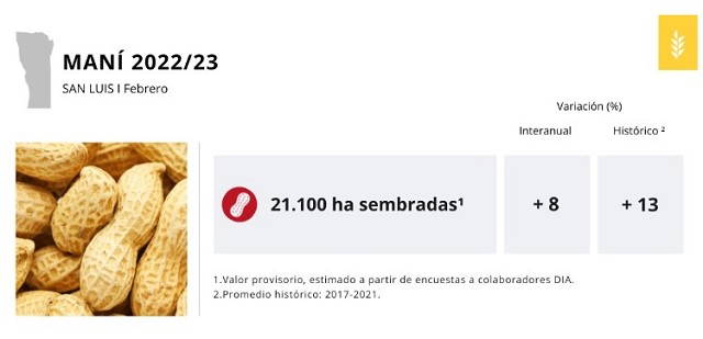 La superficie sembrada con maní en la campaña 2022/23 llegaría a 21.100 hectáreas, las cuales a finales de febrero se encontraban atravesando distintos estadios del periodo crítico. El cultivo se vio menos afectado por las condiciones climáticas, encontrándose un 62 % en condiciones buenas y muy buenas. Si bien hasta el momento no se ha reportado área perdida, los colaboradores informaron que las heladas y la falta de agua traerían consecuencias en el rendimiento.