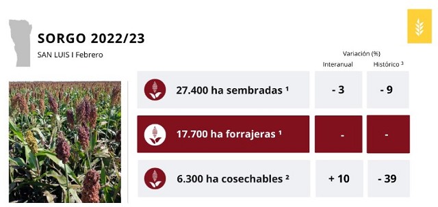 Fuente: Departamento de Información Agronómica - Bolsa de Cereales de Córdoba. Más del 90 % de las 27.400 hectáreas sembradas de sorgo se encuentran en el periodo de definición de rendimiento. En ese sentido, es de esperarse una baja en los rindes, ya que más del 45 % de los lotes tiene un estado general entre regular y malo. Por otra parte, el 35 % de la superficie destinada a grano se perdió, debido a las heladas y a la falta de agua que afectó al cultivo desde los inicios del ciclo.