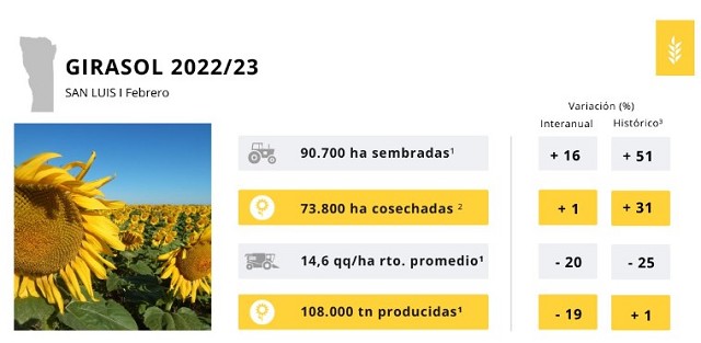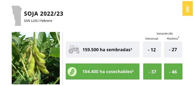 Se estima para esta campaña una superficie de 159.500 hectáreas de soja en San Luis. Este valor sería un 12 % menor que la campaña anterior y 27 % inferior al promedio histórico (2017-2021). El 36 % corresponde a soja temprana, mientras que el 64 % se sembró luego del 15 de noviembre.