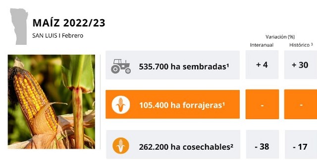 En la campaña 2022/23 se habrían sembrado 536 mil hectáreas de maíz en San Luis, lo que implica un aumento del 4 % interanual y del 30 % con respecto al promedio histórico (2017-2021). Más del 75 % de la superficie total corresponde a maíz tardío de primera, sembrado después del 1 de noviembre.