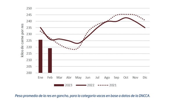 Otro indicador de esta expulsión o venta forzosa de vacas es la drástica caída en los pesos de faena que registra esta categoría. Durante el mes de febrero, el peso medio por res de vaca en gancho se situó en los 219 kg contra 226 kg obtenidos en febrero pasado. Pero si observamos el recorrido de estos números que vemos que el registro del mes pasado representa el noveno mes consecutivo en caída interanual. Desde el mes de junio del año pasado, la faena de vacas ya viene registrando menores rendimientos al gancho en relación al año previo, lo que refleja el bajo estado corporal con el que salen de los campos.