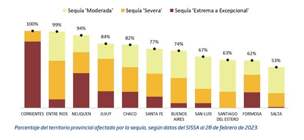 Un cálculo realizado en base la clasificación por condición de sequía que publica el SISSA (Sistema de Información de Sequías para América del Sur), apoyado en el último dato disponible de stock ganadero, arroja que el 25% del stock nacional de vacas se encuentra en zonas bajo condiciones de sequía clasificadas como “severa” a “extrema”, lo que equivale a 5,6 millones de vacas.