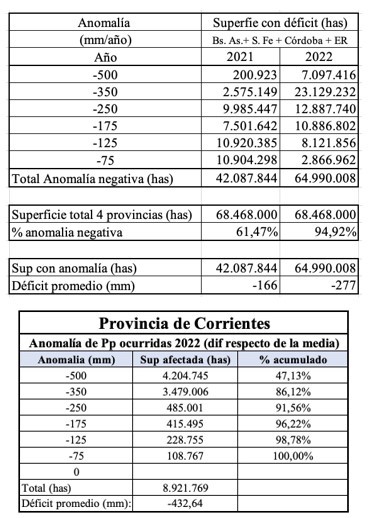 En el caso de Corrientes, los mm no recibidos por precipitaciones en 2022 fueron de 432 mm tal como se ve en las tablas siguientes.