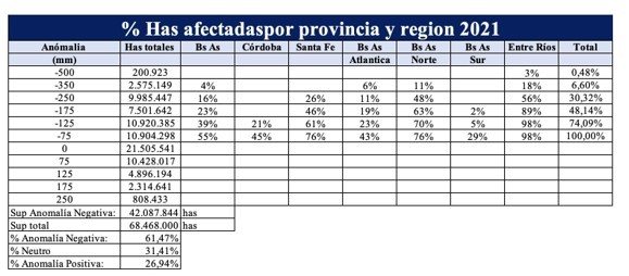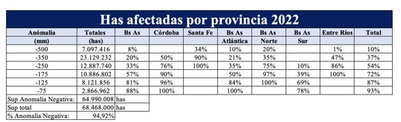 94,92 % del área total de las cuatro provincias tuvo precipitaciones menores a la media. Cuando cuantificamos cuantos mm de menos hubieron en 2021 y en 2022, vemos hubo en promedio no menos de 166 mm menos de pp en 2021 y no menos de 277 en promedio en 2022, habiendo sido afectadas este último año más de 64 millones de has sumando lo afectado en las 4 provincias.