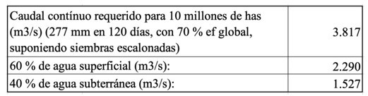 Para regar 10 millones de has proveyéndoles durante 120 días, de 277 mm, con una eficiencia global del 70 %, el caudal continuo de 3.817 m3/s.