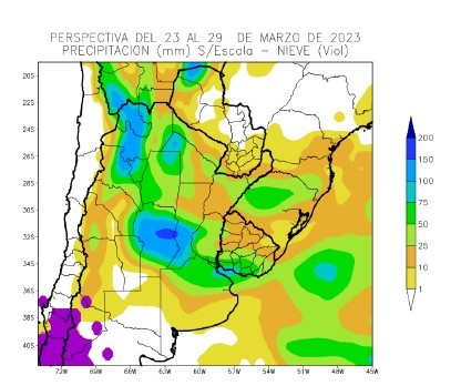 Al inicio de la perspectiva, se completará el paso del frente de tormenta, que hizo su entrada en los días precedentes, produciendo precipitaciones con su máximo sobre el centro del área agrícola, llevando aportes significativos a la Zona Núcleo y el Uruguay, y registros menores sobre el sur y el norte. Junto con el frente dará lugar a la entrada de vientos del sur, provocando temperaturas mínimas bajo lo normal, pero con leve riesgo de heladas localizadas sobre las zonas serranas y cordilleranas, incluyendo las serranías bonaerenses, y las elevaciones del centro del Uruguay. Hacia el final de la perspectiva retornarán los vientos del trópico, incrementando la temperatura, pero sin superar los registros normales, salvo algunos focos de calor intenso sobre el trópico, y registros moderados sobre las zonas serranas y el litoral atlántico.