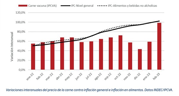 La semana pasada se conoció el Índice de Precios al Consumidor (IPC) de febrero, el cual resultó en una suba del 6,6% mensual. La división “Alimentos y bebidas no alcohólicas” mostró un incremento del 9,8% mensual y, dentro de ella, los distintos cortes de carne vacuna que componen la canasta de referencia registraron aumentos mensuales superiores al 30%.