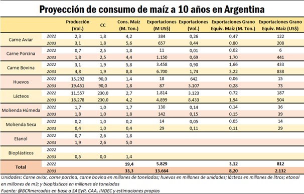 En base a estos coeficientes de conversión de maíz y considerando las proyecciones de producción, consumo y exportaciones a 10 años de los distintos sectores realizadas por la Bolsa de Comercio de Rosario el consumo interno de maíz podría situarse en 33,3 Mt en 2033, casi 14 Mt más que en la actualidad. Las exportaciones de los productos que utilizan maíz como insumo podría elevarse por lo menos hasta los US$ 13.700 millones.