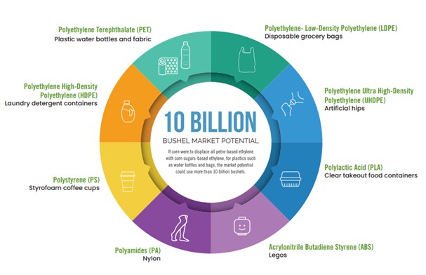 Según la NCGA, si se reemplazase todo el etileno de origen petrolero con etileno a base de azúcares de maíz, para producción de plásticos como botellas de agua y bolsas, el potencial del mercado a nivel mundial podría utilizar más de 250 millones de toneladas de maíz.