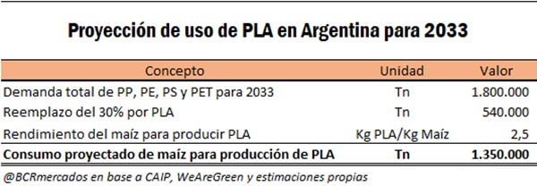 Dado que el rendimiento en la producción de PLA a base de maíz es de 1 kg de PLA por cada 2,5 kg de maíz, si se propone reemplazar el 30% de las 1.800.000 toneladas demandadas proyectadas para dentro de 10 años, la demanda de maíz para la producción de PLA totalizaría un estimado de 1.350.000 toneladas anuales.