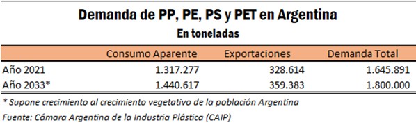 Según datos de la Cámara Argentina de la Industria Plástica (CAIP) para el año 2021, el consumo aparente del PP, PE, PS y PET en Argentina totalizó 1.317.300 toneladas, mientras que las exportaciones de estos polímeros sumaron 328.600 toneladas. Es decir, el consumo más la exportación de estos cuatro polímeros sumó 1.645.900 toneladas.