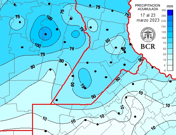 Cayeron casi 50 mm en promedio en la región; Pero ojo, porque hay registros que superaron los 100 mm pero también marcas casi nulas en el N de Buenos Aires. Finalmente, el cambio en el patrón de clima parece haber llegado a partir de la segunda quincena de marzo: cambio en la circulación, descenso de las temperaturas y precipitaciones de amplia cobertura y con importantes acumulados. Se superaron los 100 mm en Idiazábal (149,5 mm), Colonia Almada (112) y Bellville (104) en el este de Córdoba. Centro y sur de Santa Fe registró de 80 a 30mm con un claro gradiente negativo hacia el sur. En el norte de Buenos Aires reina el desconcierto: ¿porque no llueve? Hay una nueva oportunidad para las próximas 72 horas. Por lo pronto, desde Santa Teresa hasta Rufino las tormentas parecen haberse salteado ese territorio para apenas dejar entre 2 a 20 mm.