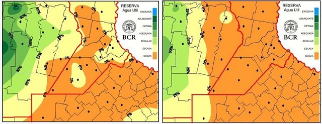 Elorriaga dice que “los condicionantes de escala regional han cambiado y favorecerán un tránsito hacia un otoño con lluvias normales. Pero no puede garantizarse que en un corto plazo llueva lo suficiente para compensar los requerimientos de los perfiles de suelo tras tres años Niña”. La imagen de reserva de agua en el suelo (izquierda) para el 1er metro del suelo actualizada el miércoles 22 muestra el cambio tras las lluvias, respecto de la semana pasada (derecha). Siguen faltando entre 80 y 120 mm para alcanzar el estado óptimo de las reservas de agua en el suelo en el 1er metro del perfil.