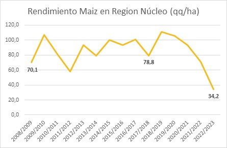 Al inicio de campaña, en la región núcleo el horizonte productivo con un escenario normal de clima mostraba 10 Mt de maíz. El 8 de febrero la estimación bajó a 4,9 Mt. Y hoy, 23 de marzo, tan solo dos semanas después, se estima que serán 3,2 Mt. Lamentablemente, la falta de lluvias y las altas temperaturas registradas hasta el fin de semana que pasó desplomaron los rindes del tardío y aumentaron las pérdidas de superficie. Las lluvias pondrán un freno a las pérdidas, pero para gran parte de lo sembrado es muy tarde. Las brutales condiciones ambientales de calor y falta de agua se llevaron por delante la estrategia defensiva se de sembrar tarde. La región comenzó y terminó la campaña sin condiciones agronómicas de producción. Por el momento, se estima que la cosecha solo será el 32% de lo que se esperaba a principios del ciclo. Respecto al volumen de maíz del año pasado —año que también fue seriamente afectada por la sequía en pleno periodo crítico de los maíces tempranos— el ciclo 2022/23 producirá tan solo la cuarta parte de dicha cosecha.