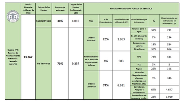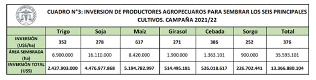 Tomando cifras de la Bolsa de Comercio de Rosario, por la campaña 2021/2022 (última información disponible al respecto), los productores invierten en una campaña agrícola unos USD 13.300 millones para la siembra de los 6 principales cultivos, como se detalla debajo: